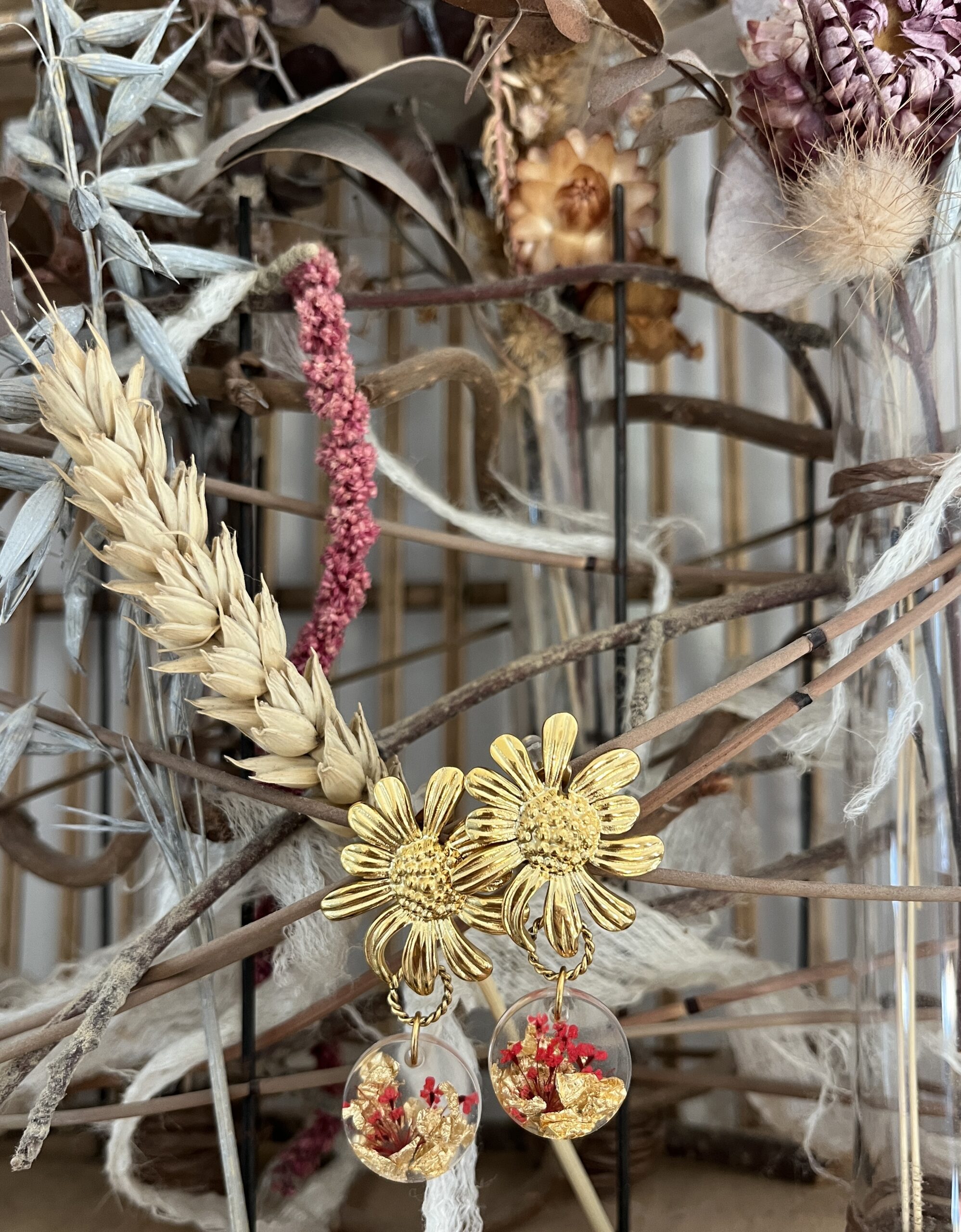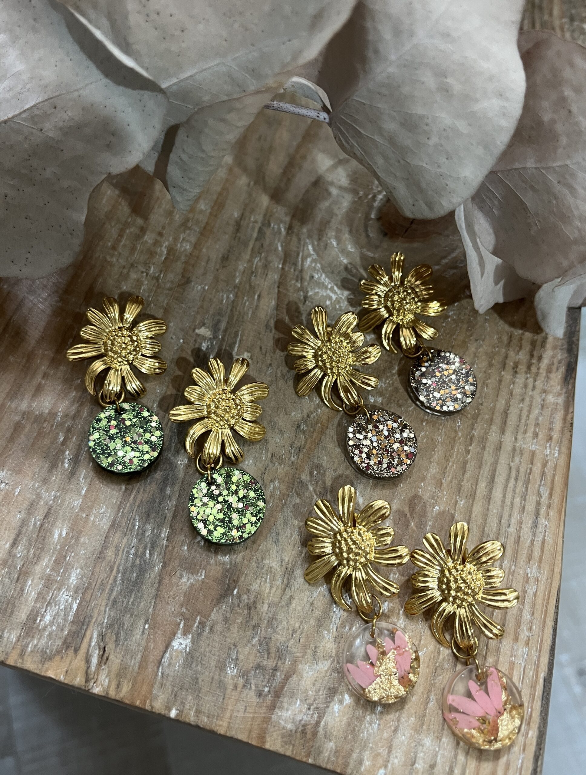 Résine époxy de forme ronde accompagnée de paillettes et/ou de fleurs séchées