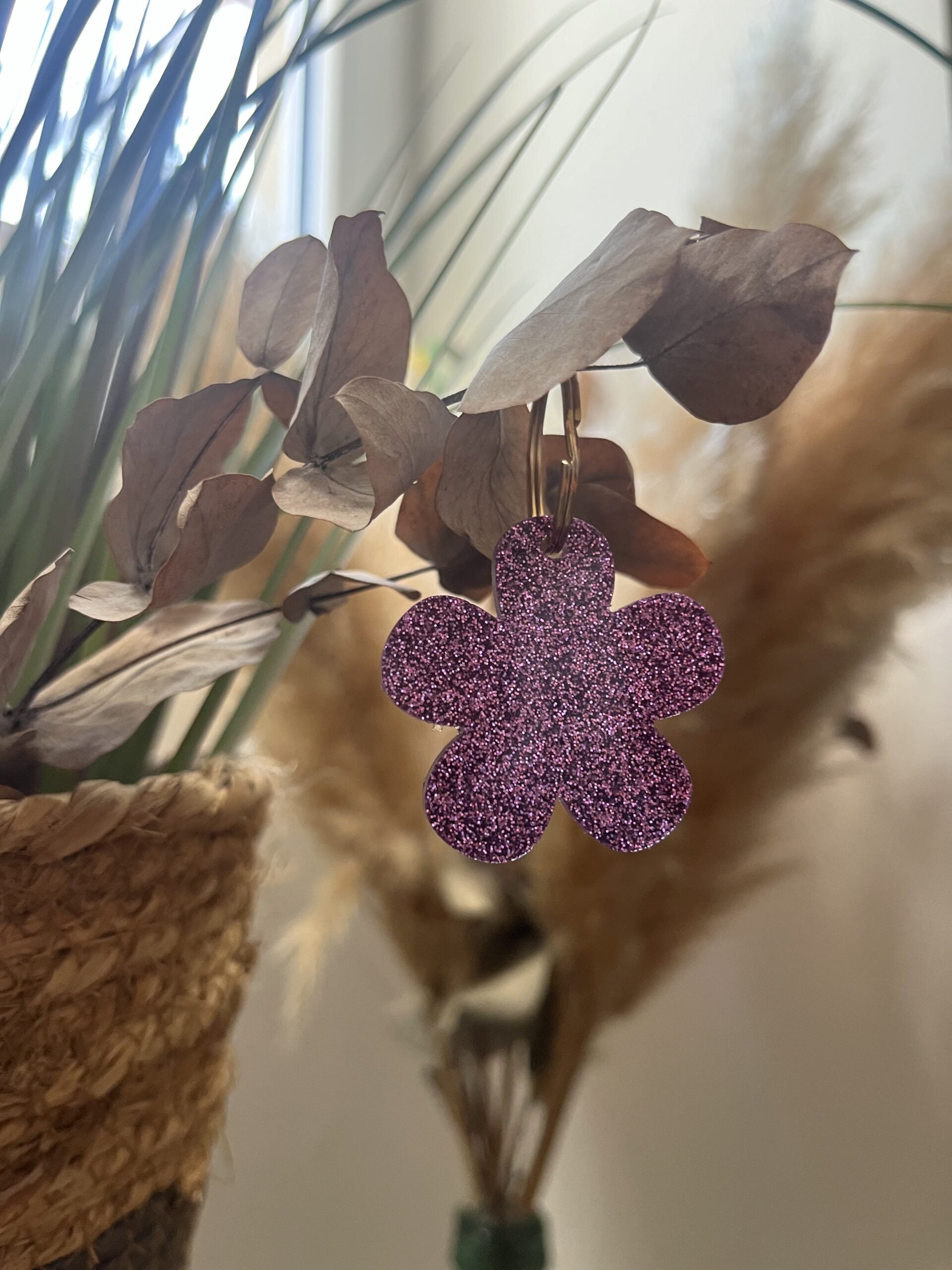 Résine époxy accompagnée de paillettes et/ ou fleurs séchées.